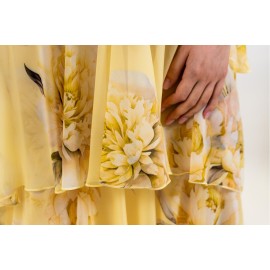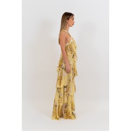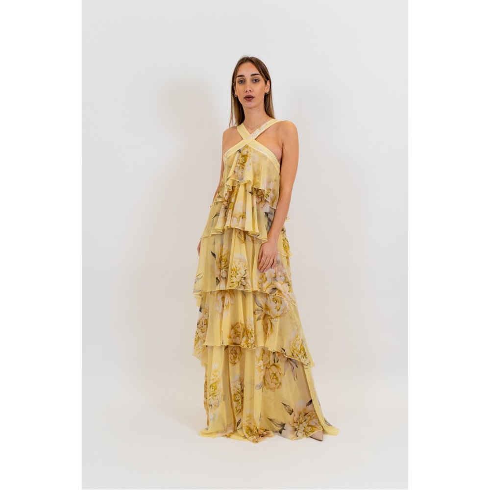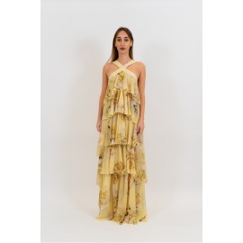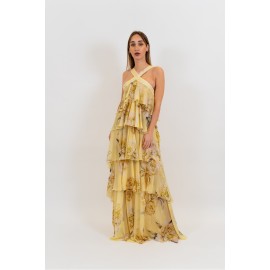 A long dress with an ethereal and romantic charm, made from lightweight chiffon printed with a delicate floral pattern in soft, sophisticated tones. The design stands out for its halter neckline with a crossover at the front that enhances the shoulders and décolleté. The upper part is embellished with light ruffles and fluid overlays that create movement and depth, giving the garment a dramatic allure. The long skirt, constructed in multiple layers with soft ruffles, accompanies your walk with lightness. Perfect for ceremonies, special events, and occasions when you want a romantic look with a strong presence.