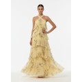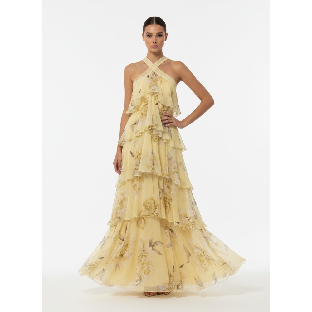 A long dress with an ethereal and romantic charm, made from lightweight chiffon printed with a delicate floral pattern in soft, sophisticated tones. The design stands out for its halter neckline with a crossover at the front that enhances the shoulders and décolleté. The upper part is embellished with light ruffles and fluid overlays that create movement and depth, giving the garment a dramatic allure. The long skirt, constructed in multiple layers with soft ruffles, accompanies your walk with lightness. Perfect for ceremonies, special events, and occasions when you want a romantic look with a strong presence.