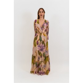 Dixie long floral print dress for women, long sleeves, V-neck, regular fit, elastic waistband. The model is wearing size S.