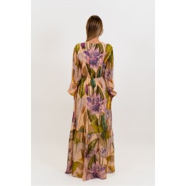 Dixie long floral print dress for women, long sleeves, V-neck, regular fit, elastic waistband. The model is wearing size S.