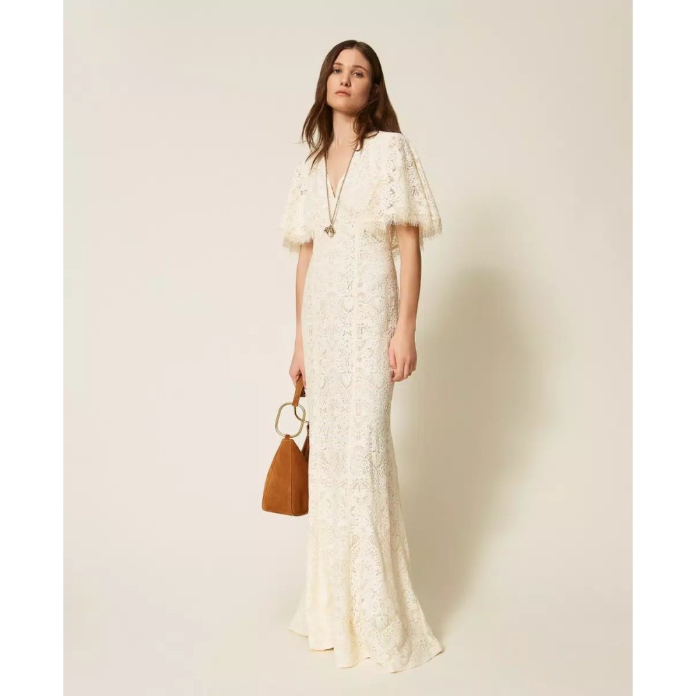 Long lace dress with short ruffled sleeves and scalloped hem. Features a V-neckline, teardrop-shaped opening with a button at the back, side zipper closure, lining, and a fitted silhouette.