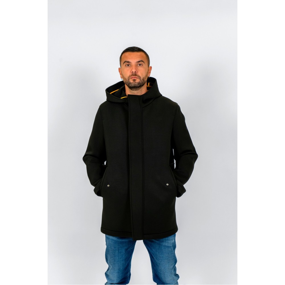 Manuel Ritz men's coat, solid color, hood,zipper and flap closure, flap front pockets, regular fit. The model is wearing size 50.
