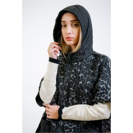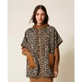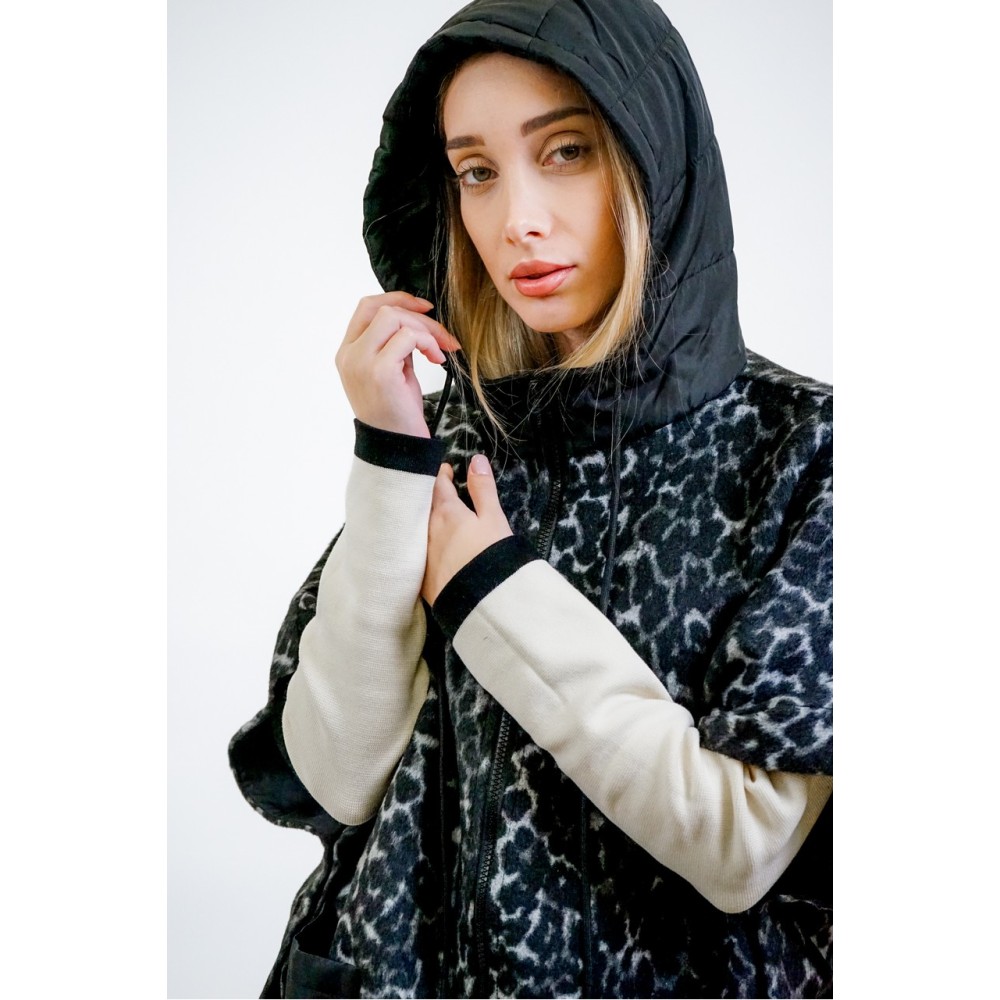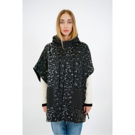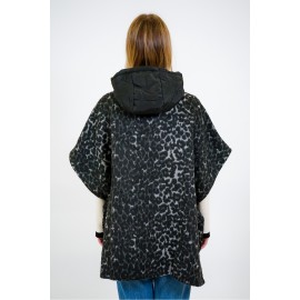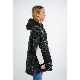 Cloth poncho with spotted animal print. It has a drawstring hood and quilted nylon patch pockets, die-cast zip closure, and snap buttons at the sides.