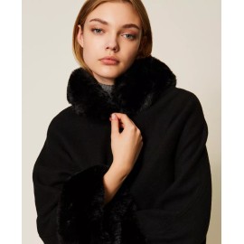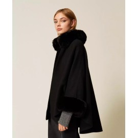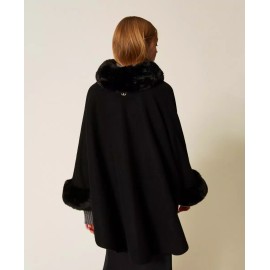 Cloth poncho with faux fur collar and cuffs. Features a hook closure at the neck and long sleeves.