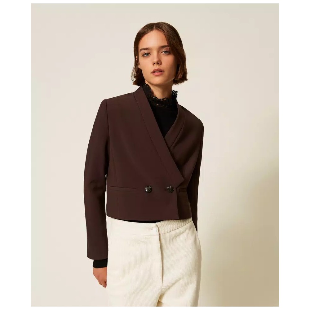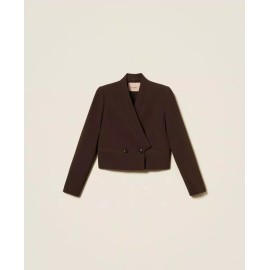 Short jacket in viscose blend double crepe with stand-up collar, double-breasted button closure, long sleeves, welt pockets, Oval T logo plaque on the back, straight cut.