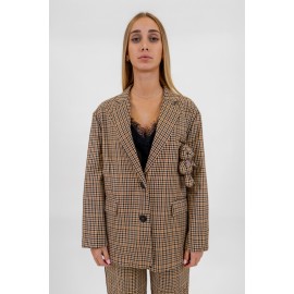 Dixie women's checked jacket, long sleeves, oversized fit, bear brooch detail, single-breasted, large front pockets with flaps. The model is wearing size XS.