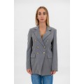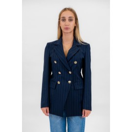 Maryley double-breasted pinstriped women's jacket, long sleeves, contrasting button detail, front flap pockets, slim fit.