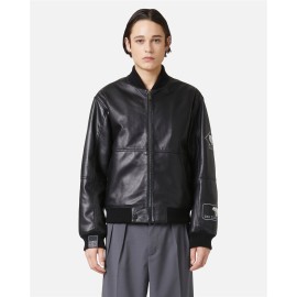 Black leather bomber jacket featuring embroidered patches with bear graphics on the sleeve, adding a playful and distinctive element to the design. The logo label on the bottom of the cuff completes the garment with a recognizable and characterful detail. A contemporary bomber jacket, perfect for those who love to mix authenticity and style.