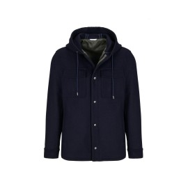 Lined jacket with hood, button closure, two side pockets and two patch pockets with flaps at the front, buttons at the cuffs, topstitched trim. Wool blend fabric