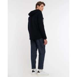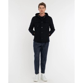 Lined jacket with hood, button closure, two side pockets and two front patch pockets with flaps, buttons at the cuffs, topstitched trim. Wool blend fabric.