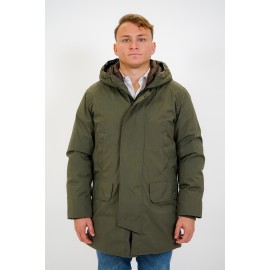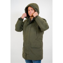 Plain men's parka with hood, zip closure, front pockets, regular fit. The model is wearing size L.