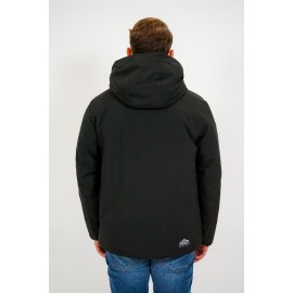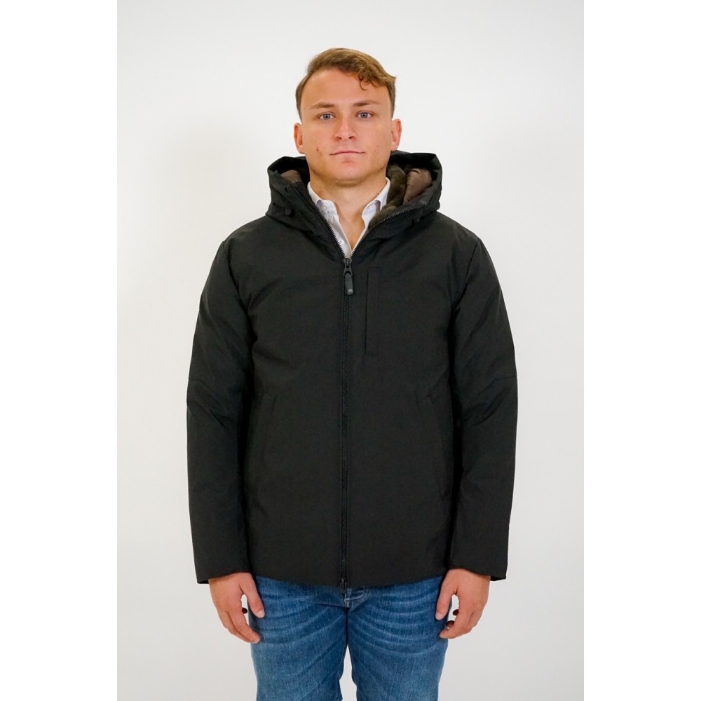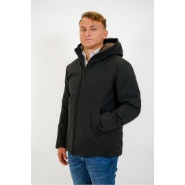 Men's parka with fur hood, zip closure, welt pockets, solid color. The model wears size M.