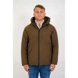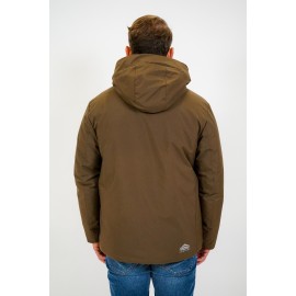 Men's parka with fur hood, zip closure, welt pockets, solid color. The model wears size M.