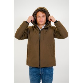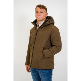 Men's parka with fur hood, zip closure, welt pockets, solid color. The model wears size M.