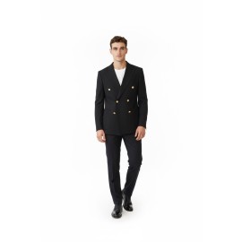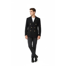 Alessandro Gilles men's double-breasted jacket in black, contrasting gold buttons, peaked lapels, long sleeves, regular fit.