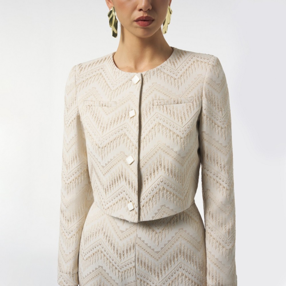 A crop blazer with a bold and sophisticated character, made from a jacquard fabric with an ethnic weave that evokes artisanal influences and exotic atmospheres.