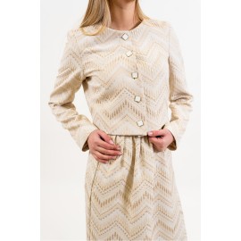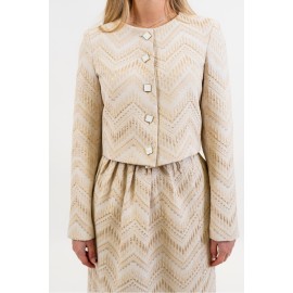 A crop blazer with a bold and sophisticated character, made from a jacquard fabric with an ethnic weave that evokes artisanal influences and exotic atmospheres. The short cut enhances the waistline, creating a modern and structured silhouette. The fabric, rich in textures and geometric patterns, adds depth and personality to the garment. The design is completed by classic lapels, a front button closure, and long sleeves with clean lines, which perfectly balance the cropped proportions. The fit is defined but comfortable, ideal for pairing with matching skirts or high-waisted pants for a particularly distinctive look.