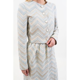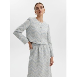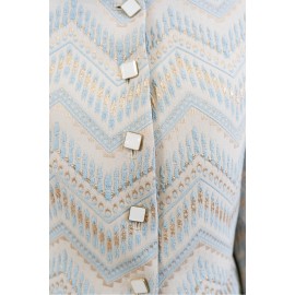 A crop blazer with a bold and sophisticated character, made from a jacquard fabric with an ethnic weave that evokes artisanal influences and exotic atmospheres. The short cut enhances the waistline, creating a modern and structured silhouette. The fabric, rich in textures and geometric patterns, adds depth and personality to the garment. The design is completed by classic lapels, a front button closure, and long sleeves with clean lines, which perfectly balance the cropped proportions. The fit is defined but comfortable, ideal for pairing with matching skirts or high-waisted pants for a particularly distinctive look.