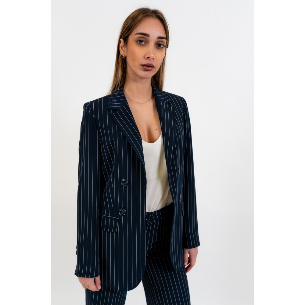 Women's double-breasted pinstripe blazer without a closure, regular fit. The model is wearing size 40.