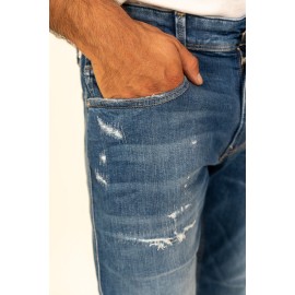 Replay men's jeans model 573 eco plus, 5 pockets, button and zipper closure, broken details, slim fit.