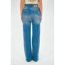 Women's palazzo jeans, high waist, zip and button closure, 5 pockets, regular fit.