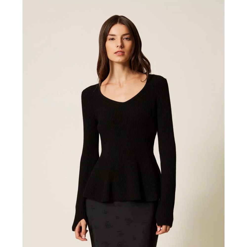 Viscose blend sweater with English ribbing, V-neck, long glove sleeves, flared hem, Oval T logo plaque on the back.