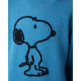 New regular fit crew neck sweater in dark sky blue wool and alpaca slub yarn, with a flat knit that enhances the texture of the fabric. The center front is embellished with simple embroidery, while the upper back features an inlaid rectangle in reverse satin with tone-on-tone Iceberg embroidery. A warm, graphic garment that strikes the perfect balance between comfort and visual identity.