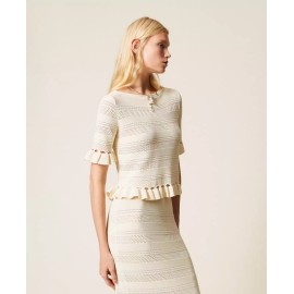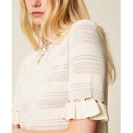 Jersey in viscose crepe yarn with alternating smooth and punched sections and mesh stitching that create horizontal stripes. It has a boat neck, short sleeves, hems finished with small ruffles, and a soft line.