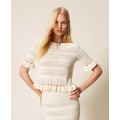 Jersey in viscose crepe yarn with alternating smooth and punched sections and mesh stitching that create horizontal stripes. It has a boat neck, short sleeves, hems finished with small ruffles, and a soft line.