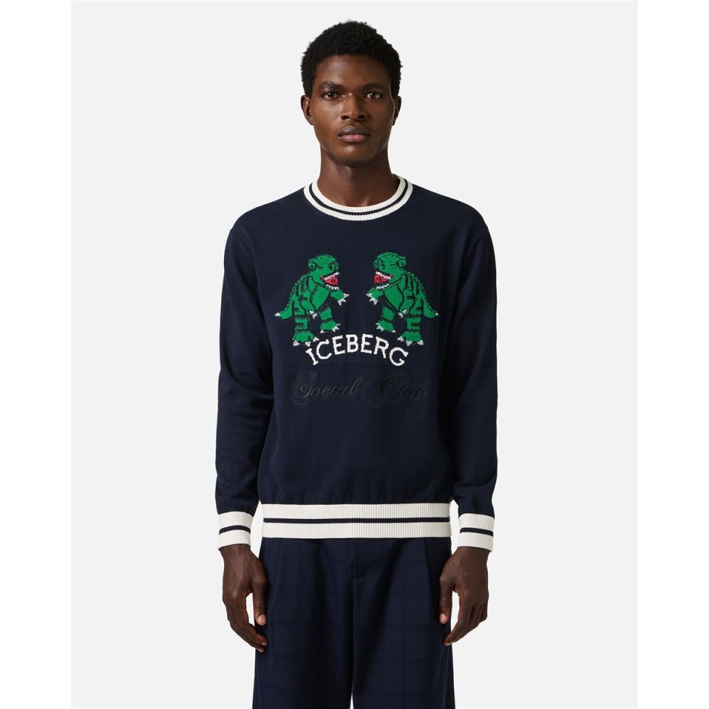 Classic blue cotton crew neck sweater with drop stitch detailing, defined by the dragon motif inlay on the front and the embroidered Social Club lettering. The small contrasting sporty stripes on the collar and cuffs complete the design with a dynamic touch. A garment that combines comfort, graphic character, and Iceberg identity.
