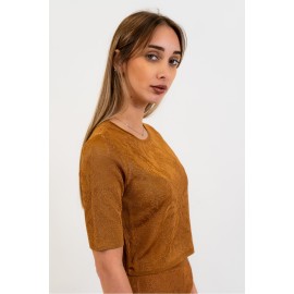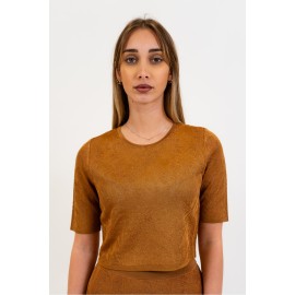 Twinset women's cropped sweater with short sleeves, embroidery, slim fit, and a button closure at the back. The model is wearing size XS.