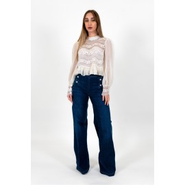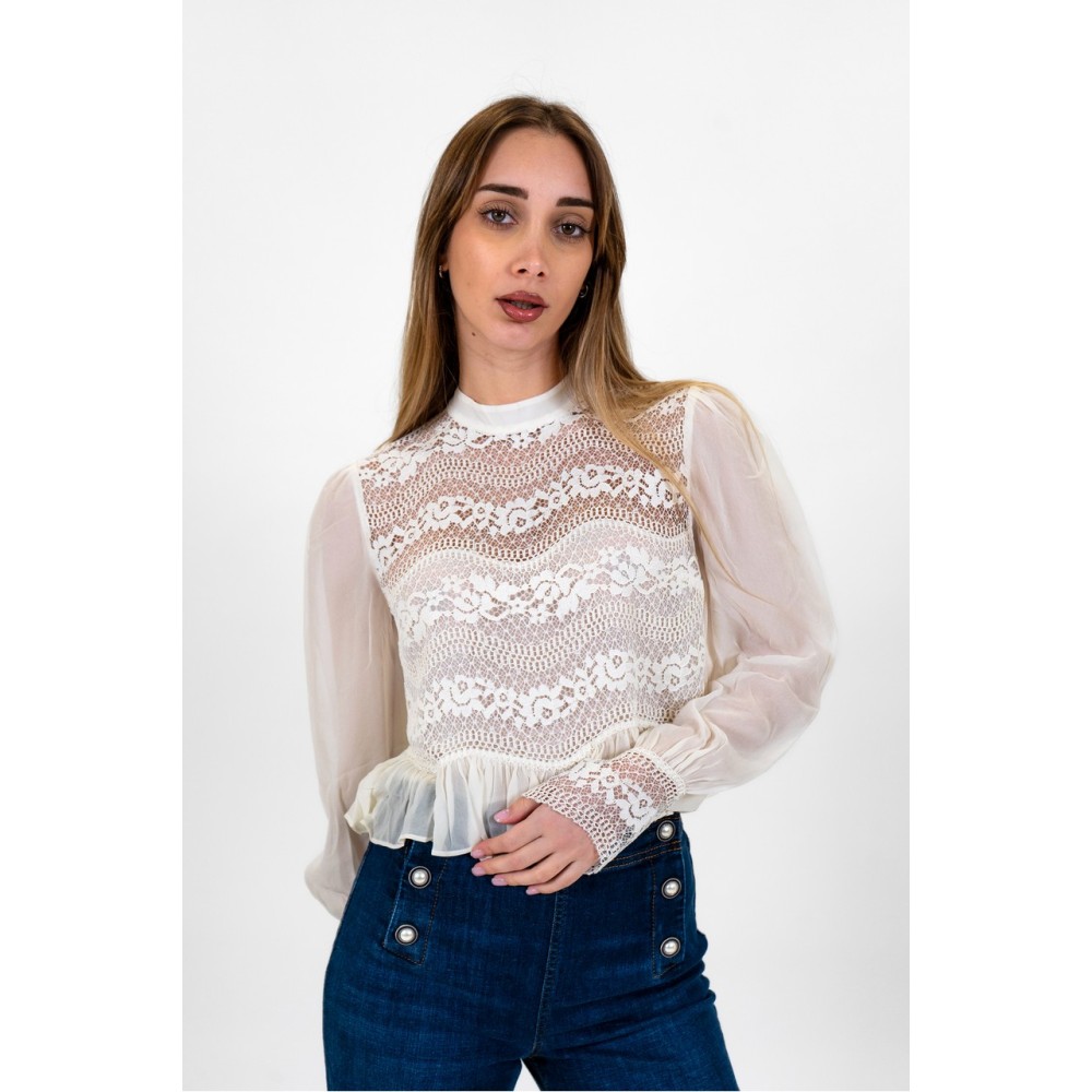 Twinset embroidered women's blouse with long sleeves, embroidered cuffs with button closures, and a regular fit. The model is wearing size 38.
