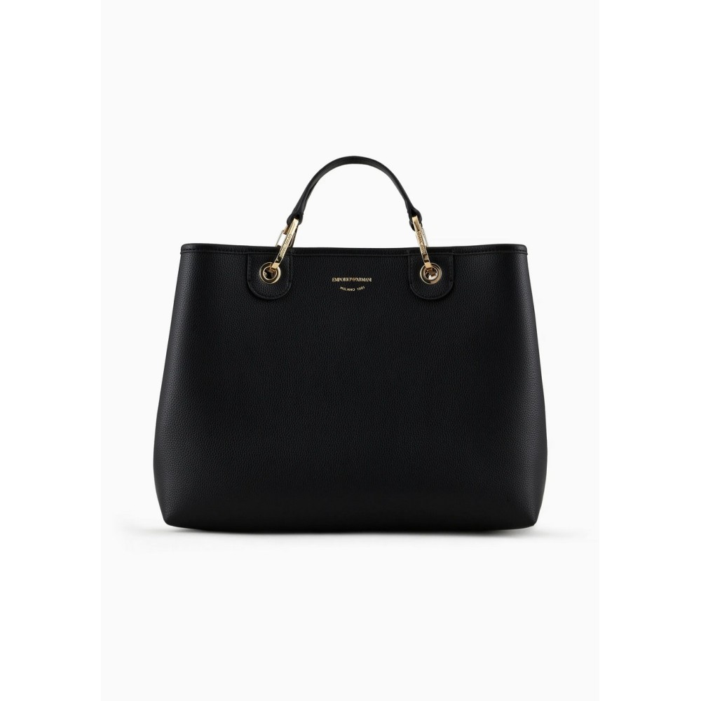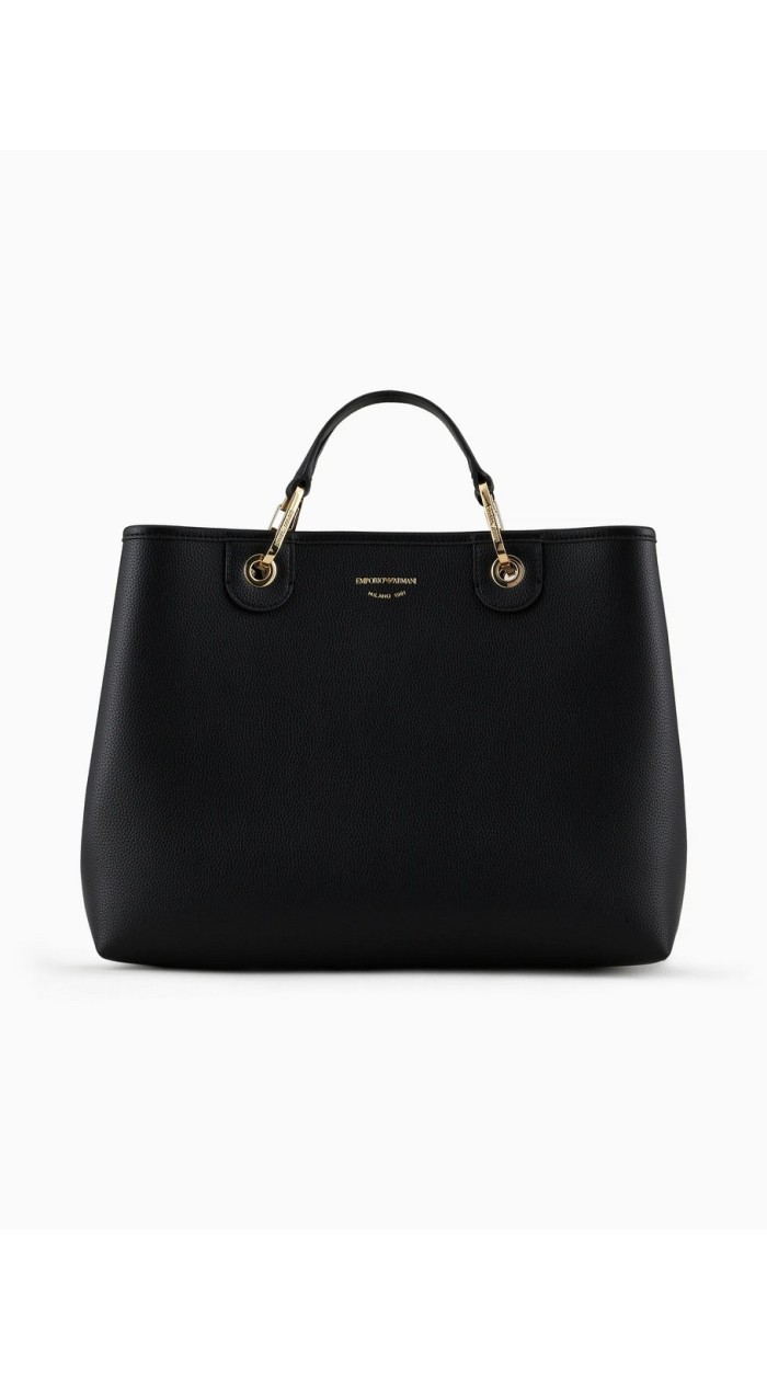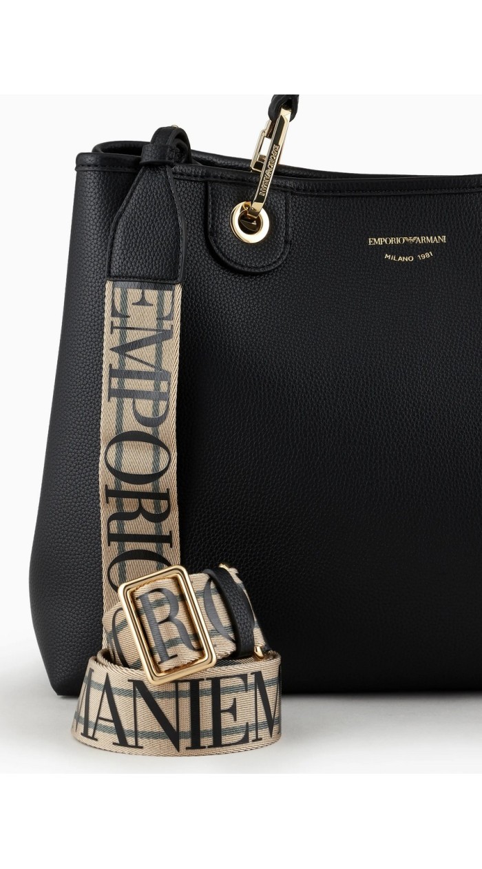 Medium-sized shopper bag with deer print finish, magnetic closure, and screen-printed logo. Features a matching internal pouch with zip and removable logo shoulder strap.