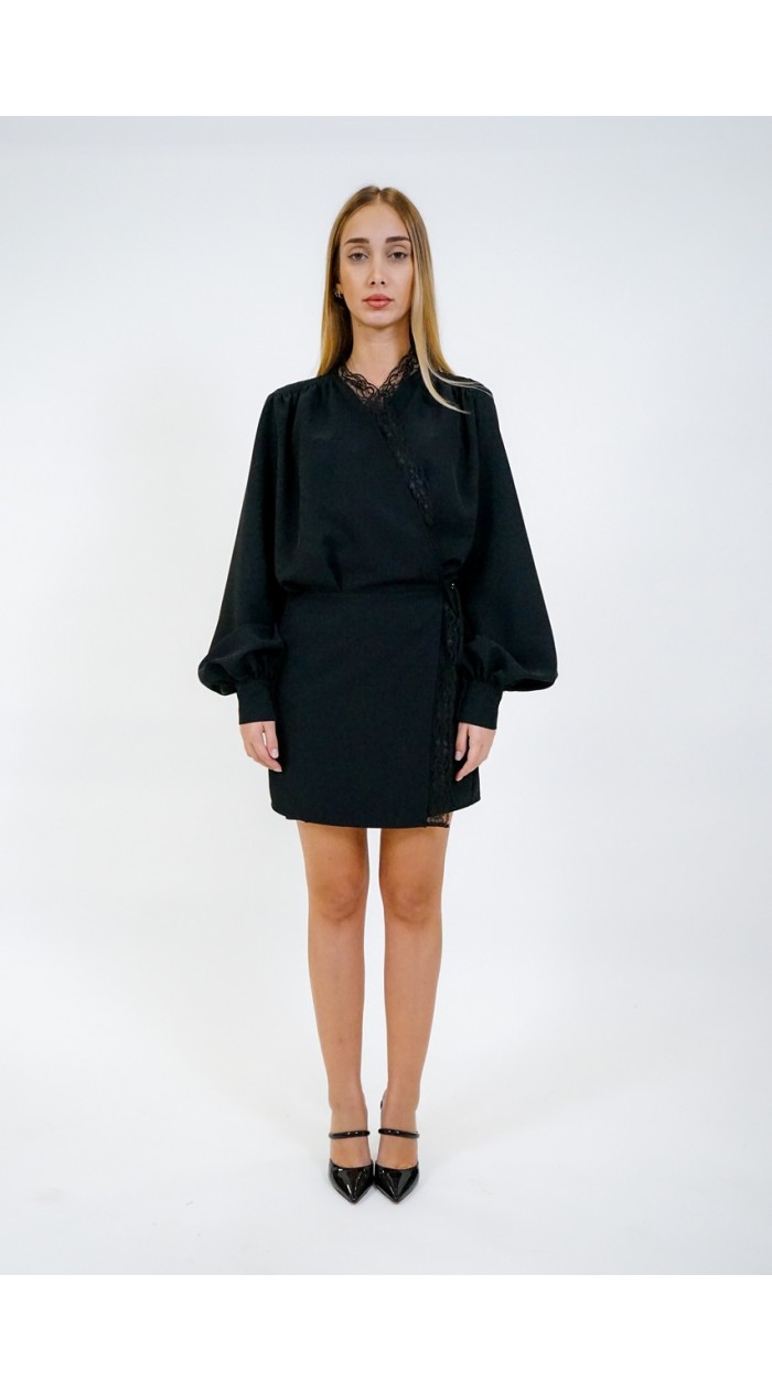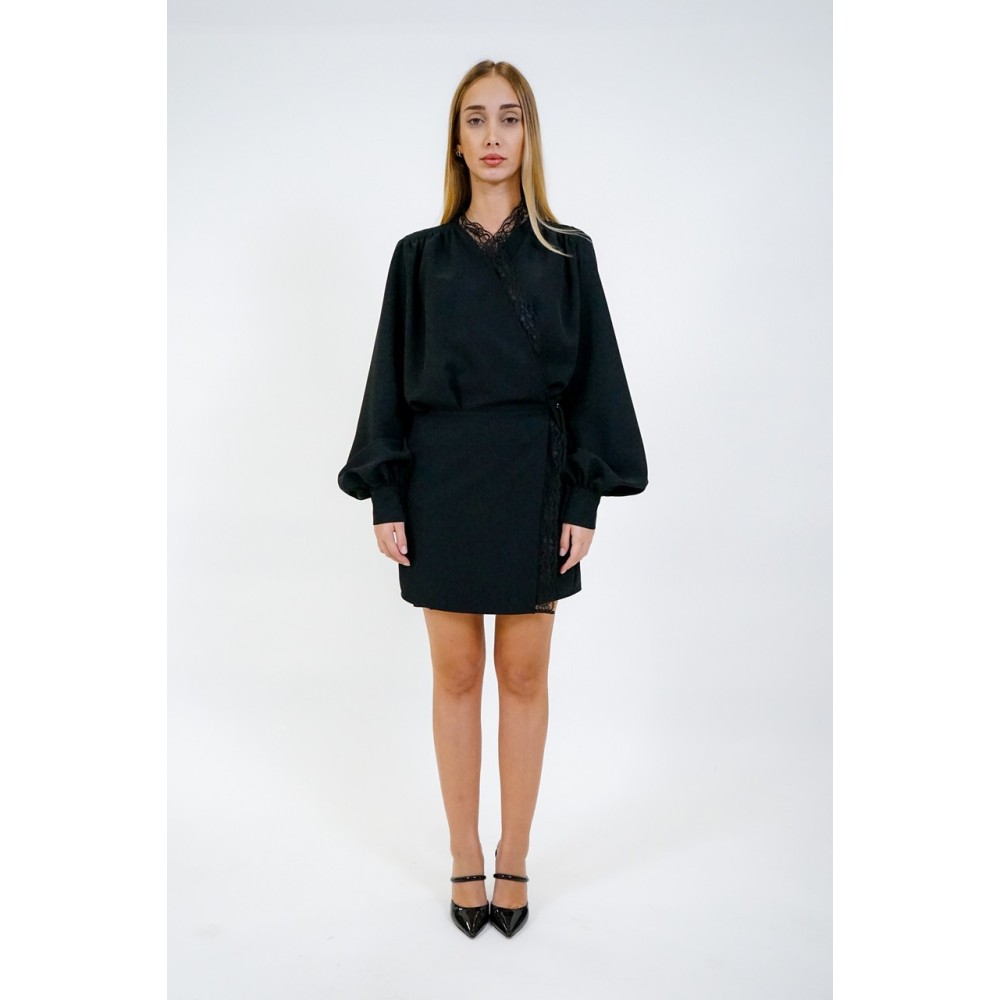 Maryley women's short dress, plain, balloon sleeves, wrap closure. Lace detail. The model is wearing size S.