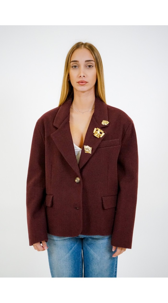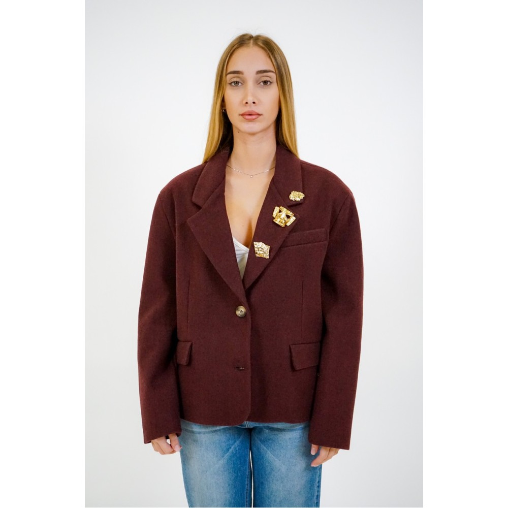 Dixie women's jacket, oversized crop style, single-breasted, welt pockets on the front, brooch detail on the collar.