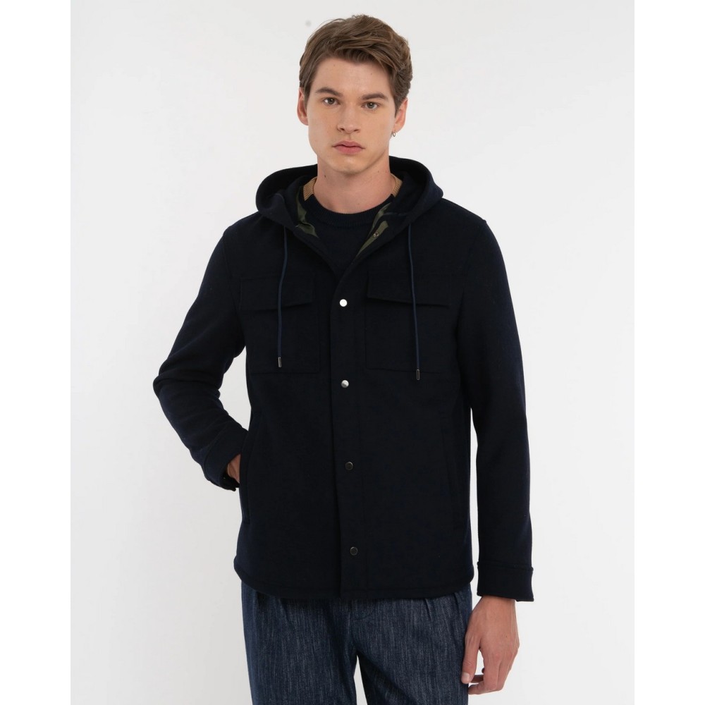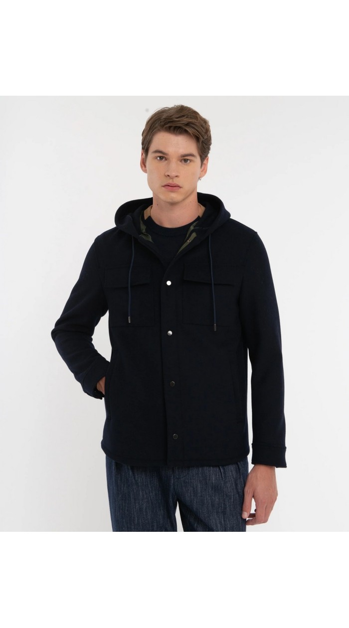 Lined jacket with hood, button closure, two side pockets and two front patch pockets with flaps, buttons at the cuffs, topstitched trim. Wool blend fabric.
