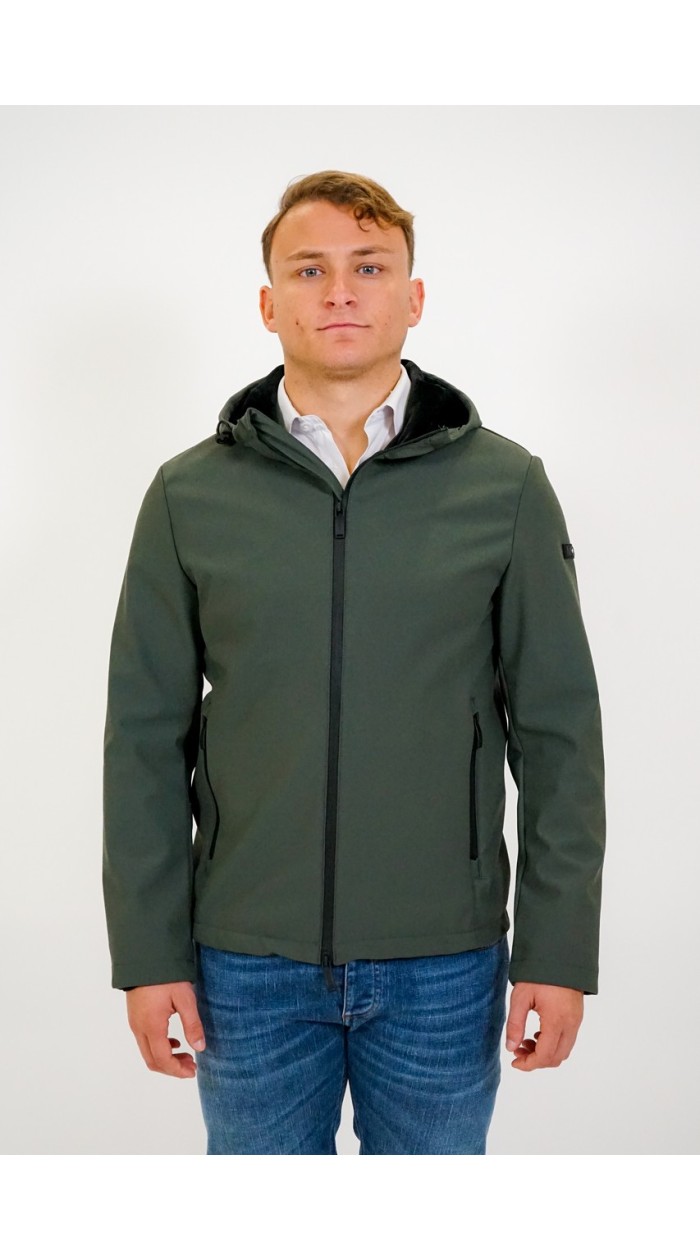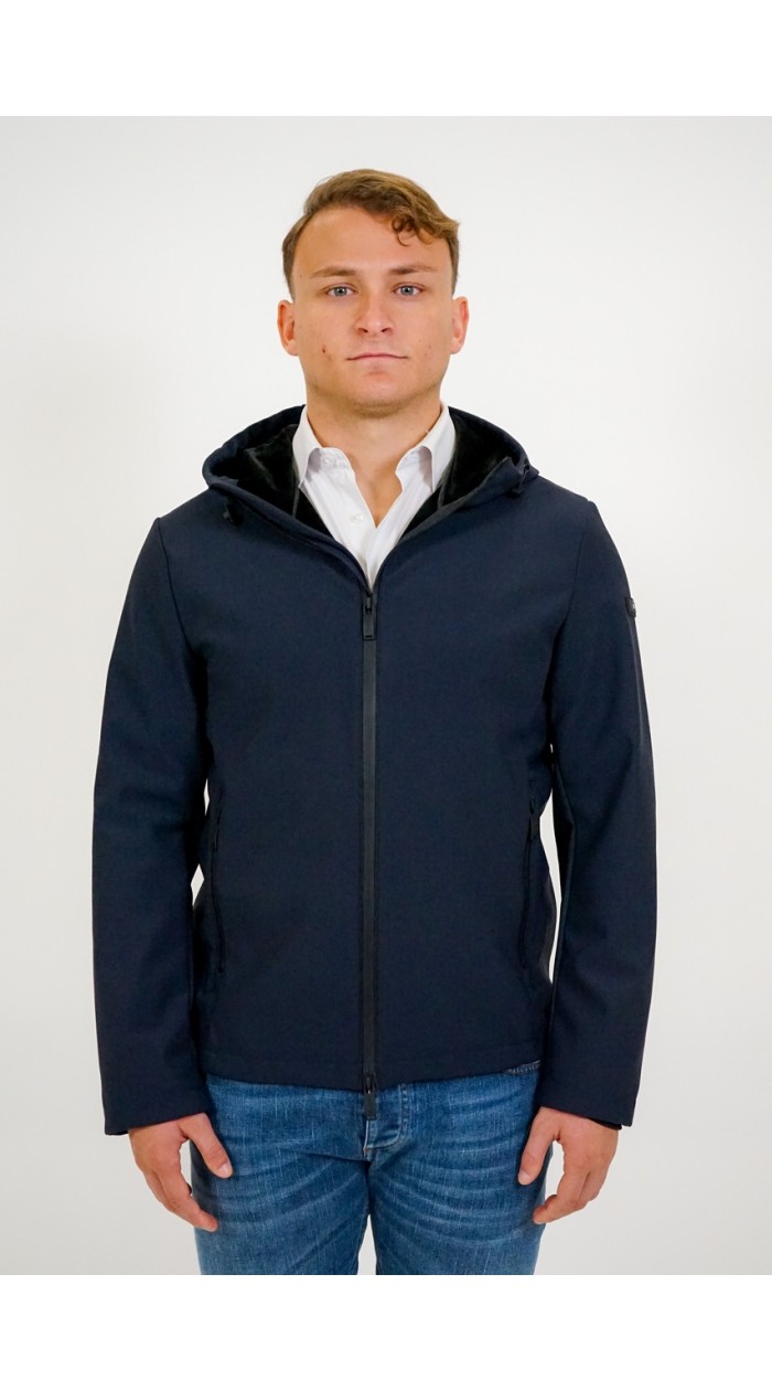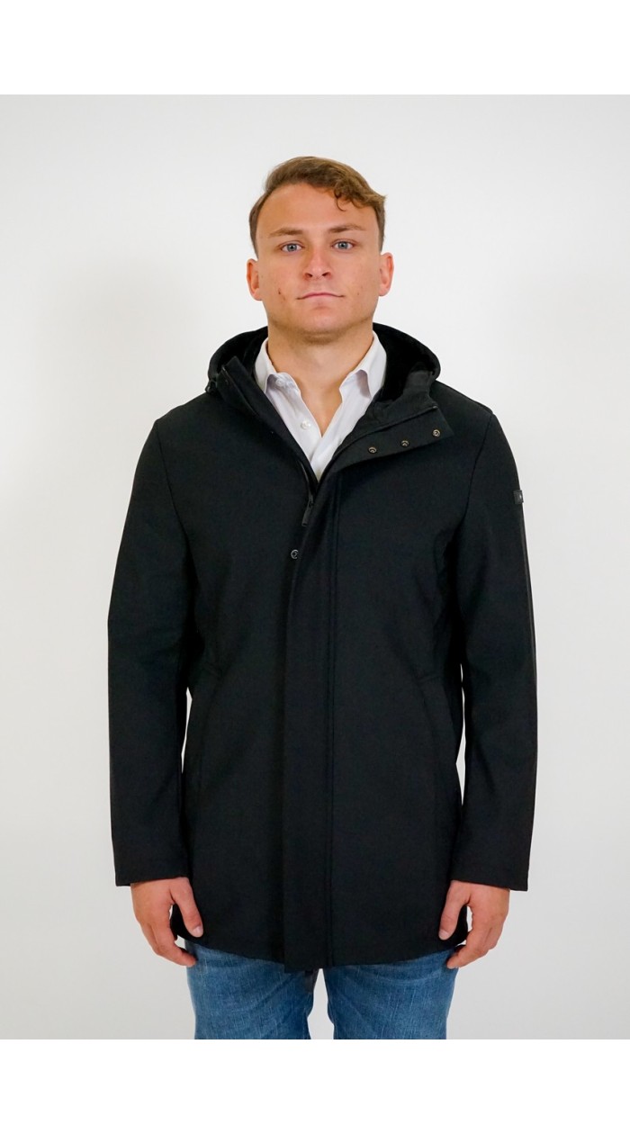 More men's short hooded jacket, solid color, zip closure, welt pockets, slim fit. The model is wearing size L.