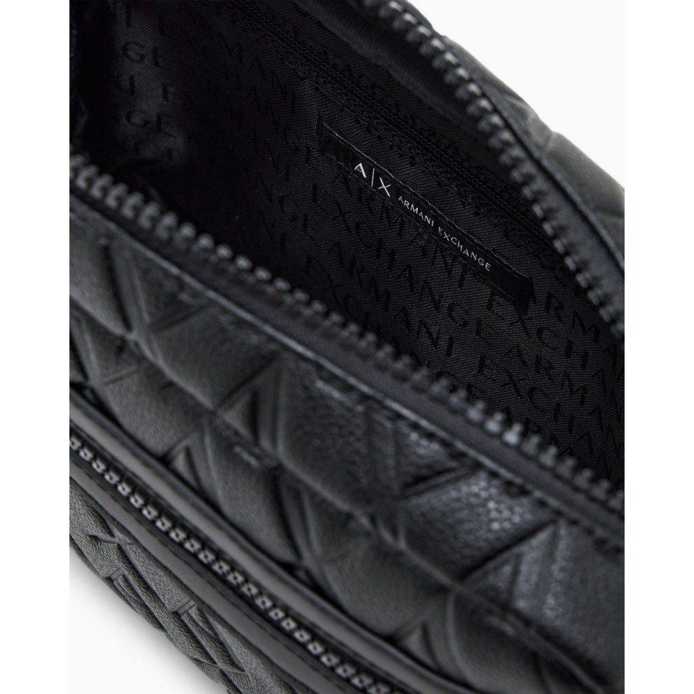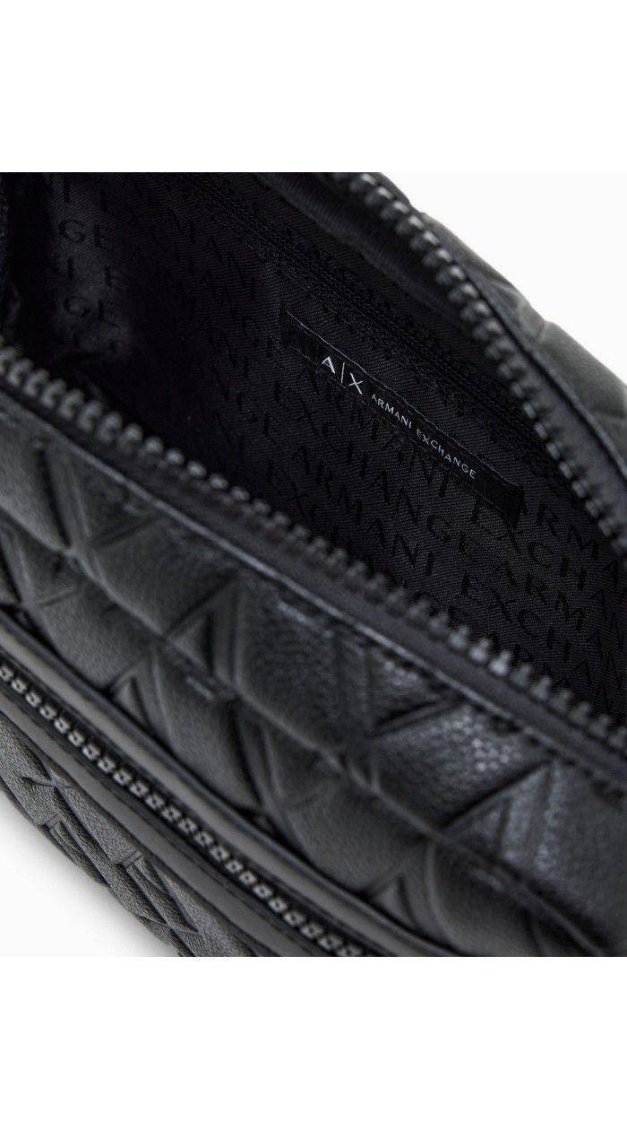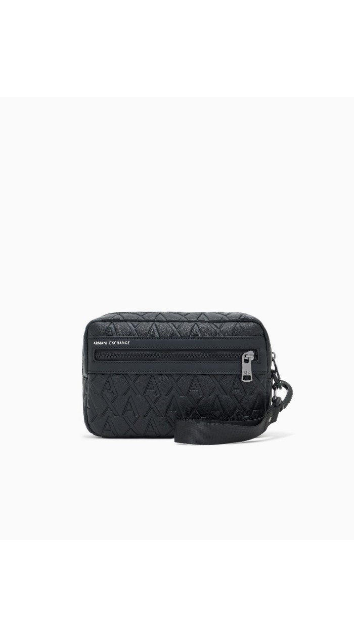 Clutch bag made from durable material with tone-on-tone embossed logo, zip closure, and removable wrist strap.