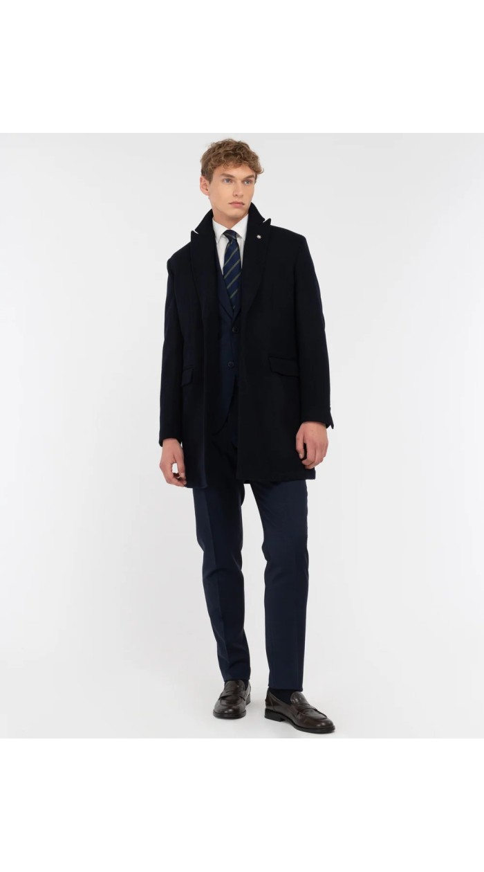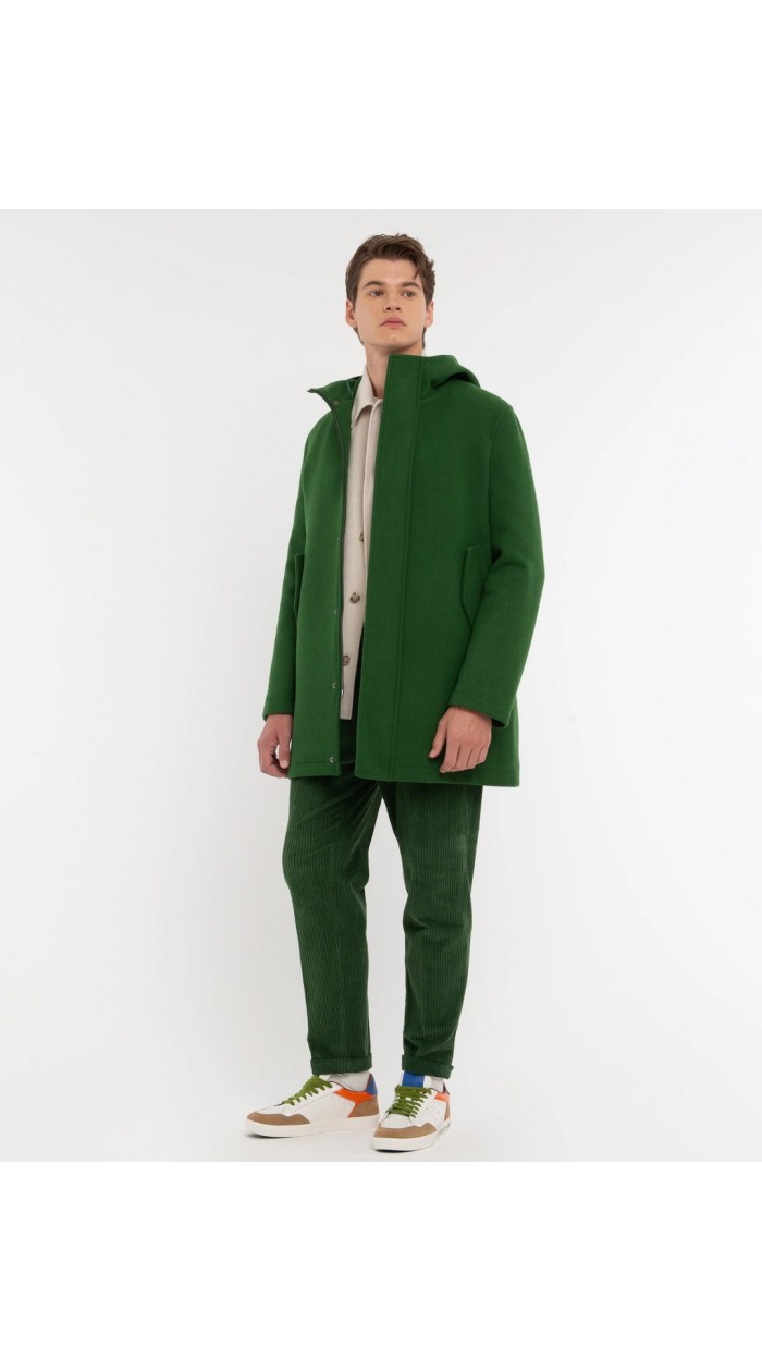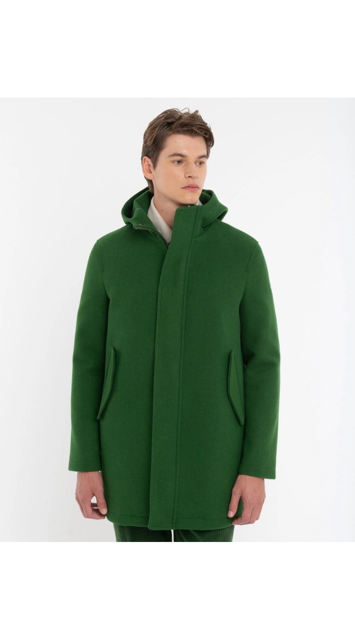Lined parka, zip closure with concealed snap buttons, two side pockets with snap button closure. Wool blend fabric.