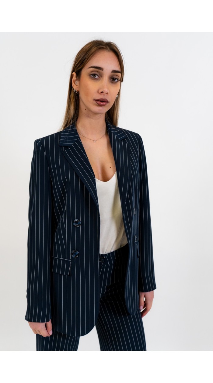 Women's double-breasted pinstripe blazer without a closure, regular fit. The model is wearing size 40.