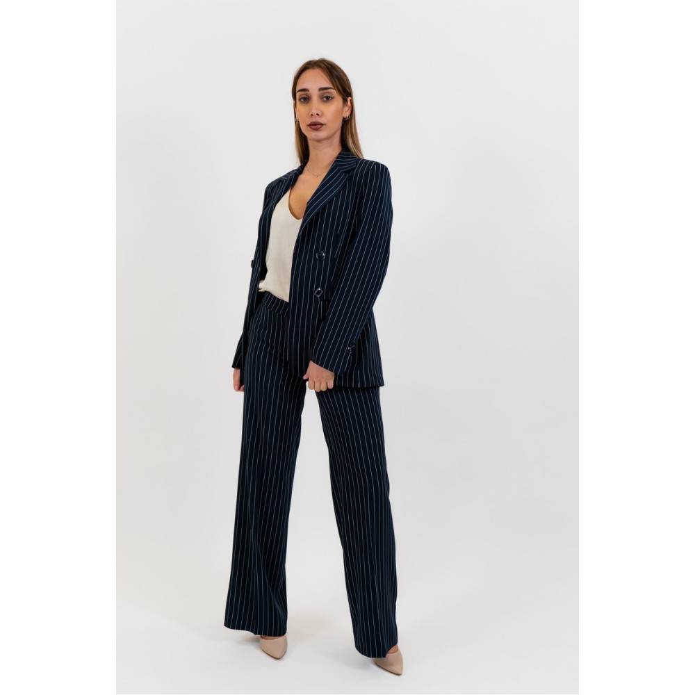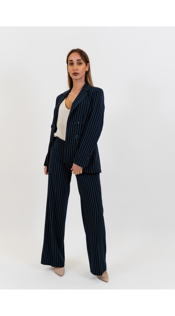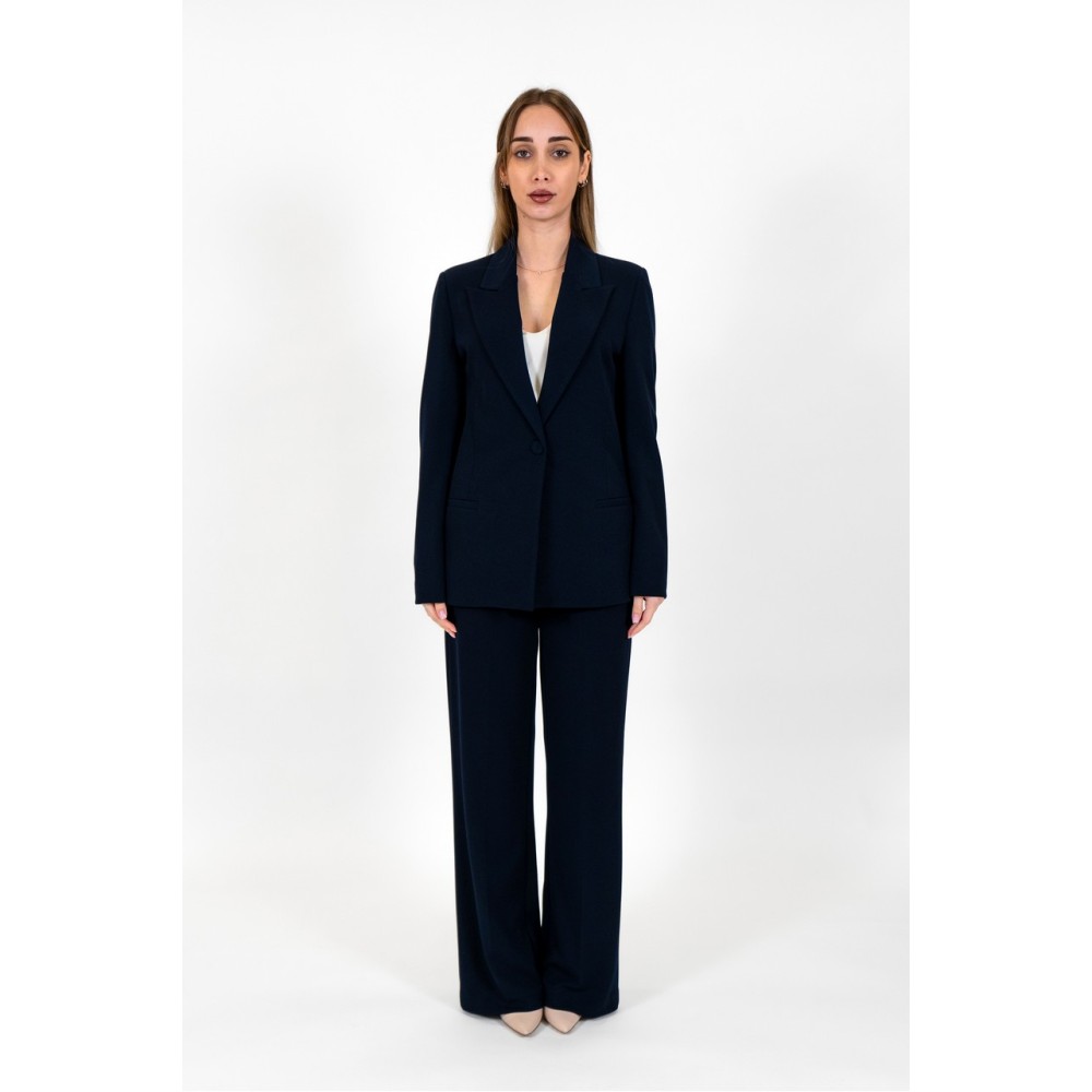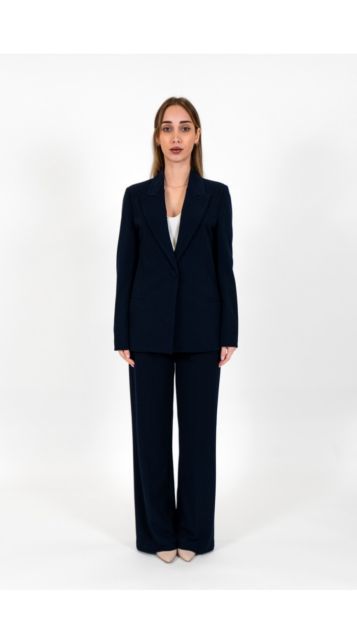Dixie solid-color women's suit, featuring a slim-fit single-breasted jacket. Solid-color palazzo pants with a zip and button closure. The model is wearing size XS.