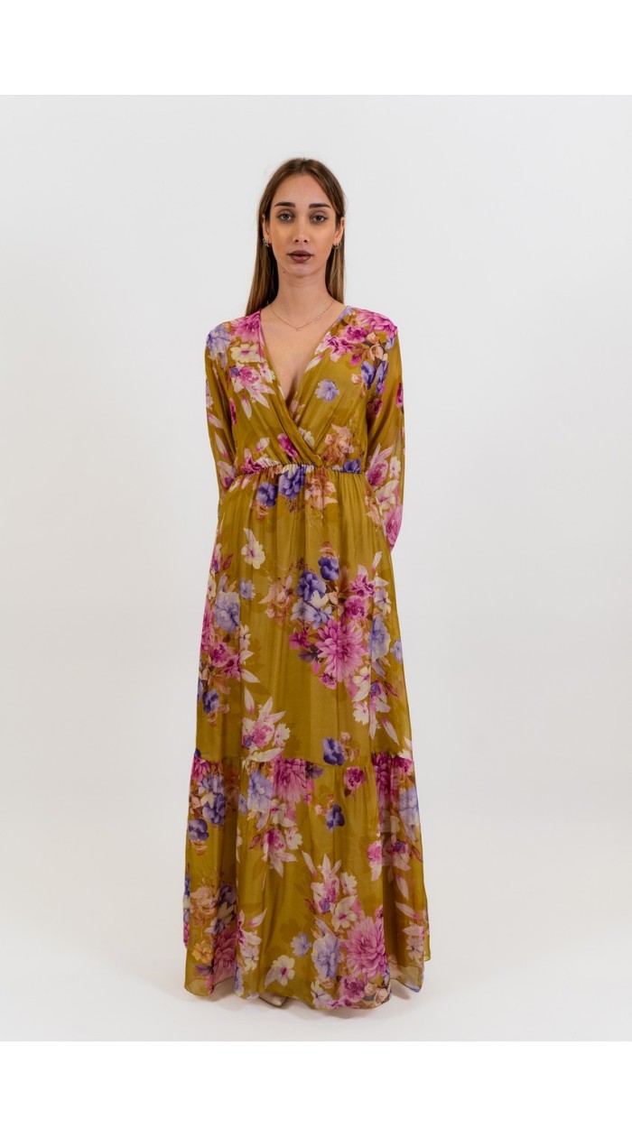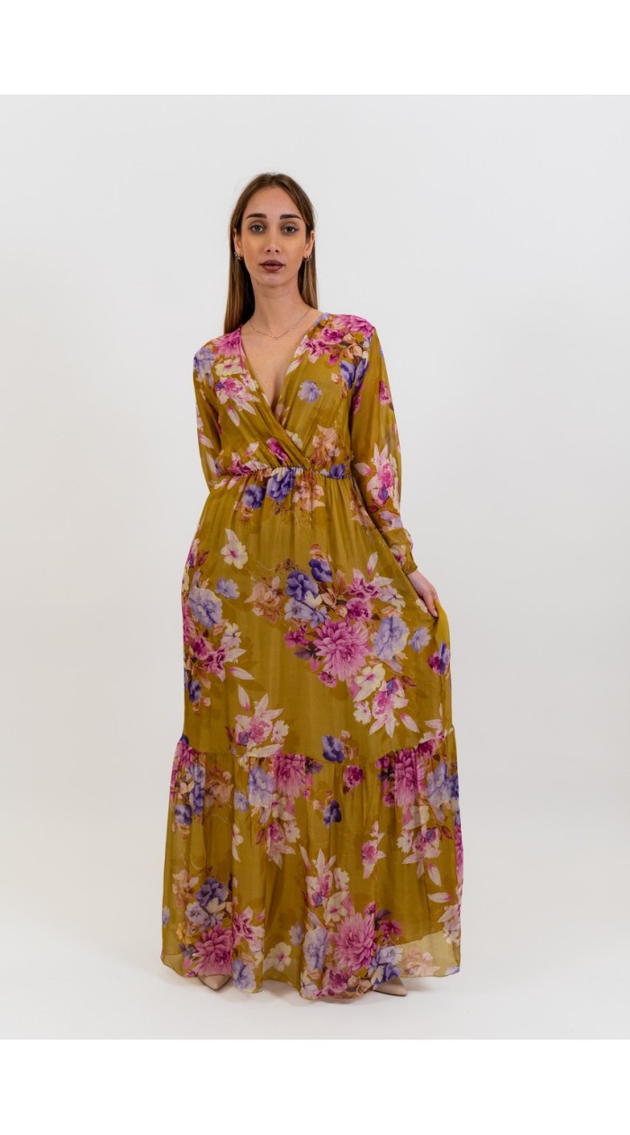 Dixie long floral dress for women, featuring a V-neck, long sleeves, an elastic waistband, and a regular fit. The model is wearing size S.