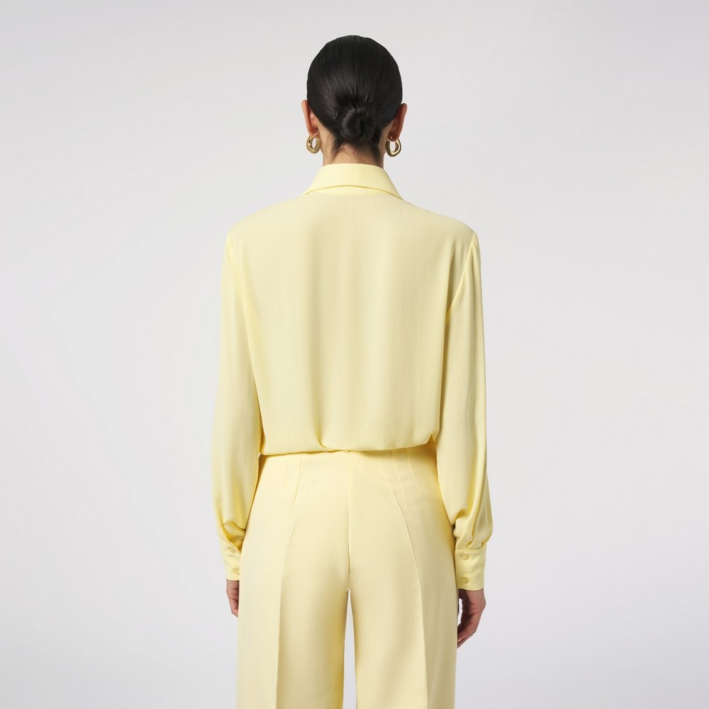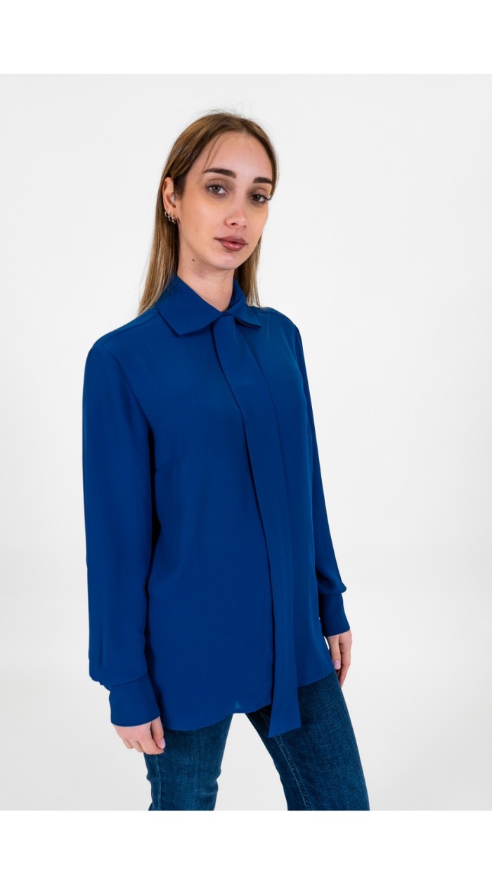 A shirt crafted from an elegant, lightweight chiffon fabric with a minimalist design, featuring a classic collar and a hidden front button closure.