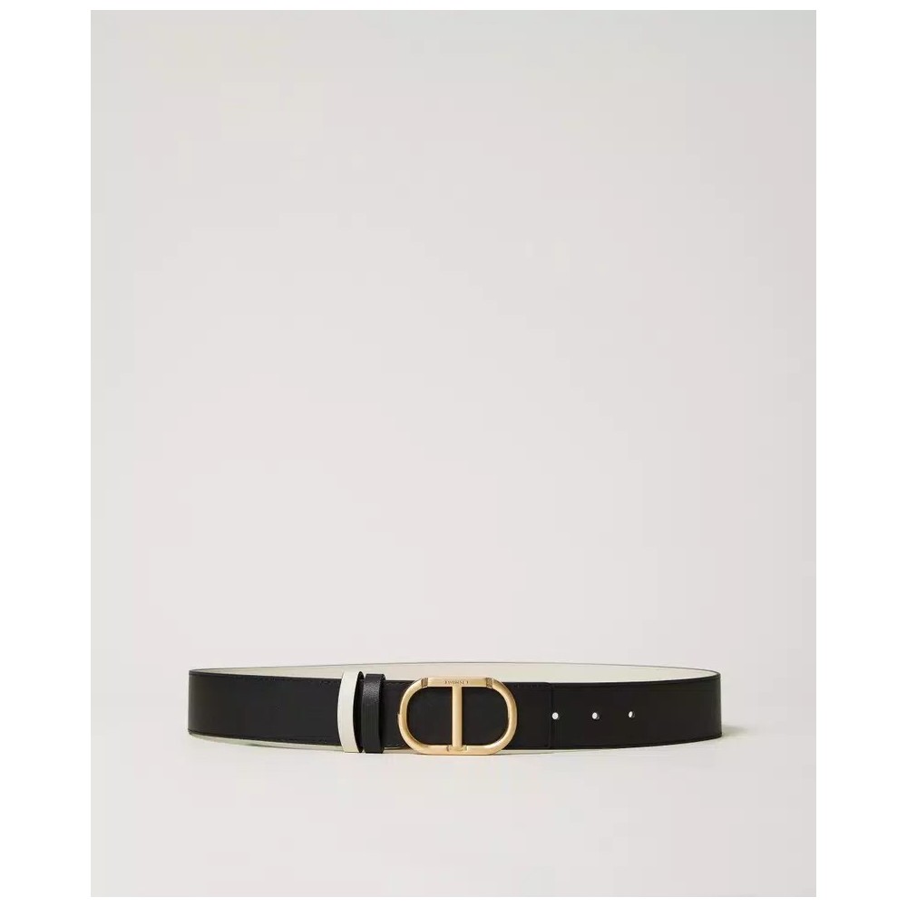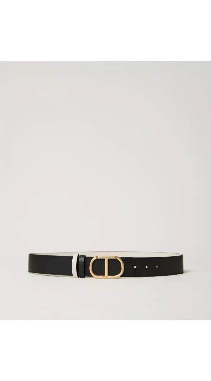 Reversible low waist leather belt with removable gold electroplated Oval T buckle, two-tone loops.