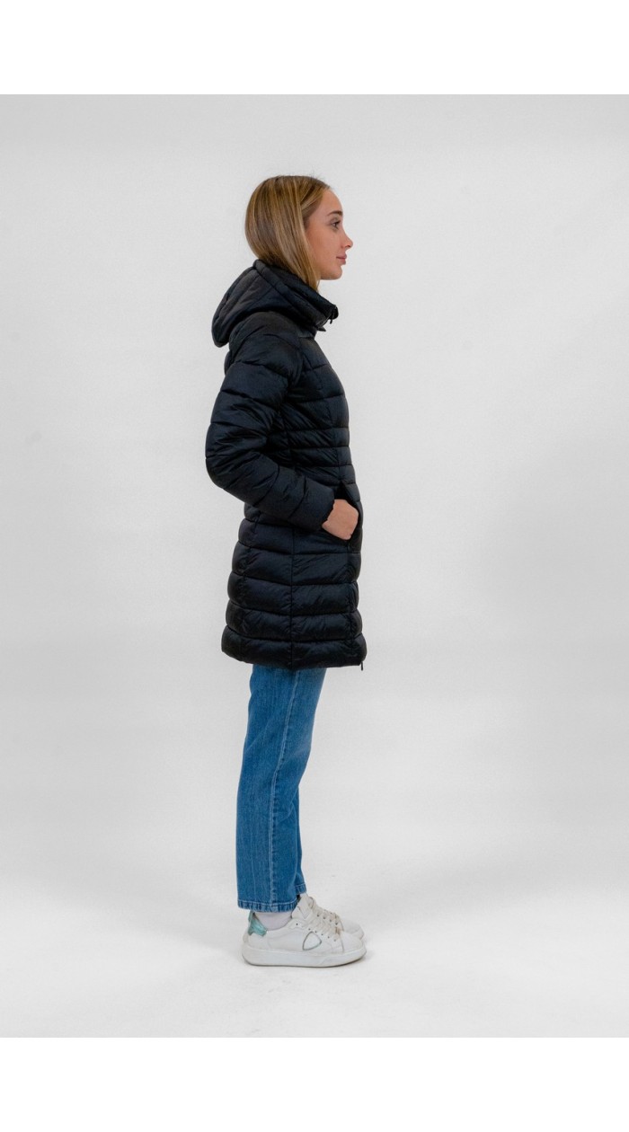 Padded jacket made of laminated fabric with hood and full-zip closure. The model is characterised by contrasting colour details, side pockets and a drawstring at the bottom.
