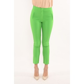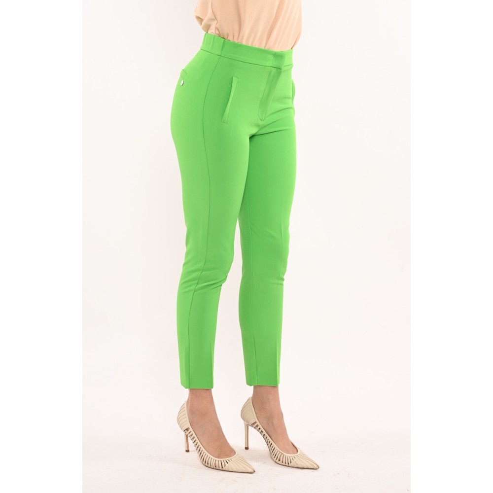 Kontatto women's wire pocket pants, solid color, elastic back, zipper and clip closure, slim fit. The model is wearing size S.