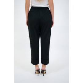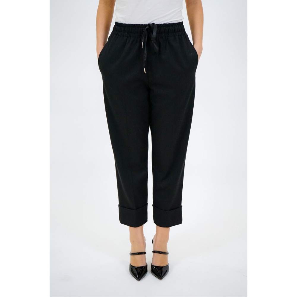 Women's cigarette pants, elastic waistband with drawstring, pleats at the bottom.
