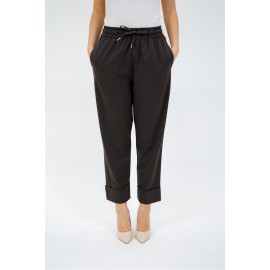 Women's cigarette pants, elastic waistband with drawstring, pleats at the bottom.