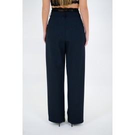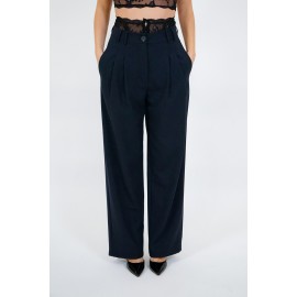 Haveone women's palazzo pants with pleats, lace detail at the waist, slash pocket, zip and button closure, high waist. The model is wearing size XS.