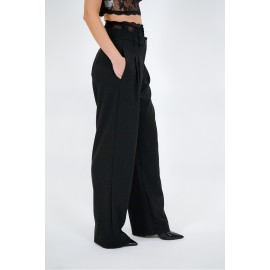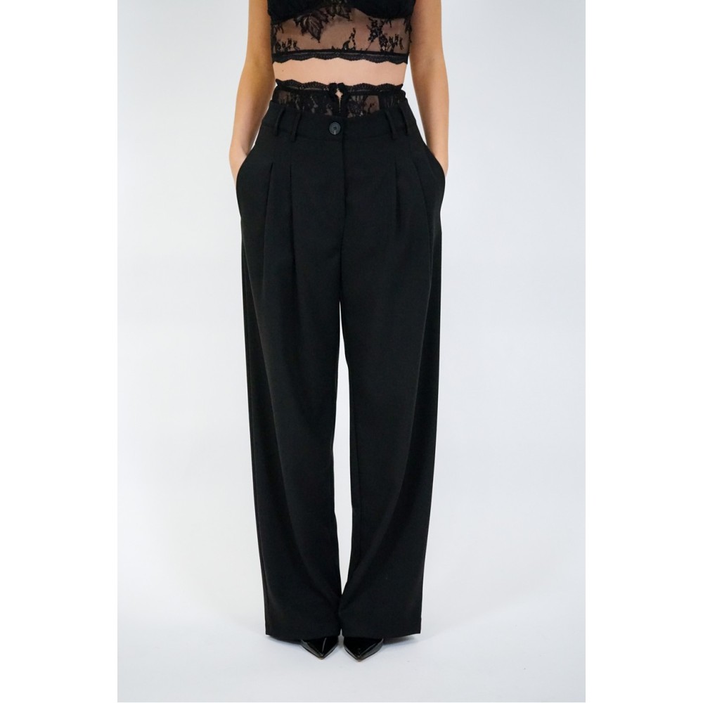 Haveone women's palazzo pants with pleats, lace detail at the waist, slash pocket, zip and button closure, high waist. The model is wearing size XS.